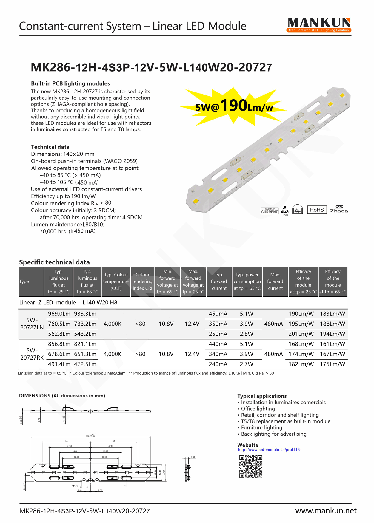 20*70mm Zhaga constant current linear module CRI 80 LED Module 20727